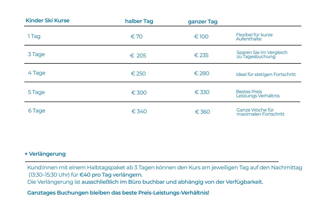 Die Bedeutung von Skikursen: Professionelle Skikurse bieten Kindern den besten Einstieg, denn sie erhalten klare, strukturierte Anleitung von ausgebildeten Skilehrern. So lernen sie von Anfang an die richtige Technik und wichtige Sicherheitsregeln – und haben dabei jede Menge Spaß mit anderen Kindern.