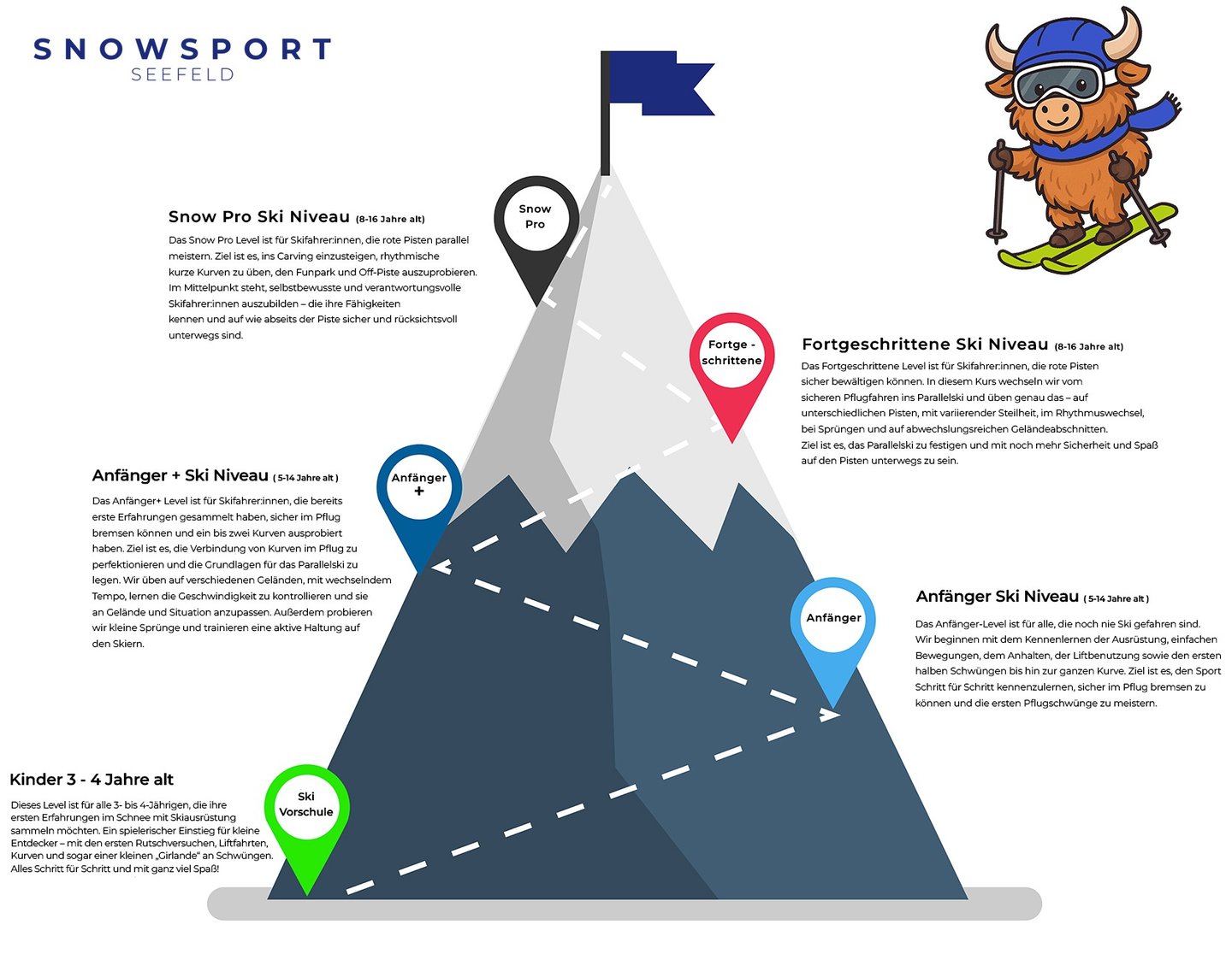 Dieses Level ist für alle 3- bis 4-Jährigen, die ihre ersten Erfahrungen im Schnee mit Skiausrüstung sammeln möchten. Ein spielerischer Einstieg für kleine Entdecker – mit den ersten Rutschversuchen, Liftfahrten, Kurven und sogar einer kleinen „Girlande“ an Schwüngen. Alles Schritt für Schritt und mit ganz viel Spaß!